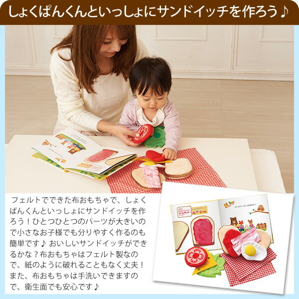 セット内容 絵本×1、トマト×1、チーズ×1、レタス×1、パン×2、ジャム×1、ベーコン×2、タマゴ×1、クロス×1 サイズ 絵本:18.5×1.0×18.5cm、サンドイッチ:12×1.2×10cm、クロス:約37×28cm 箱サイズ 24×24×6cm(予告なく変更となる場合があります) 素材 絵本:紙 サンドイッチ、クロス:ポリエステル 生産国 中国(予告なく変更となる場合があります) 納期 営業日12時までにいただいたご注文に関しましては当日中に発送いたします。